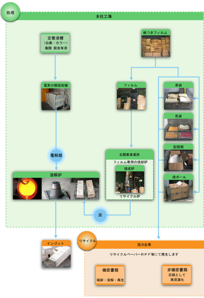 紙付フィルムは北焼成工場に搬入され、有銀フィルム・無銀フィルム・機密書類・廃プラスチック類に選別された後、